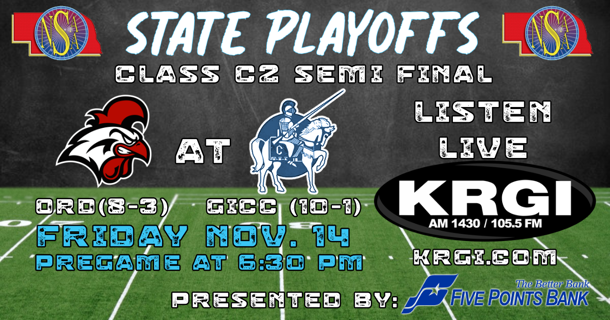 Listen to GICC vs Ord on KRGI 1430 AM/105.5 FM & krgi.com presented by Five Points Bank, starting with the Pump and Pantry Preview Show at 6:00 pm followed by the Pump and Pantry Pregame Show at 6:30 pm with a conversation with Head Coach Jeff Ashby.