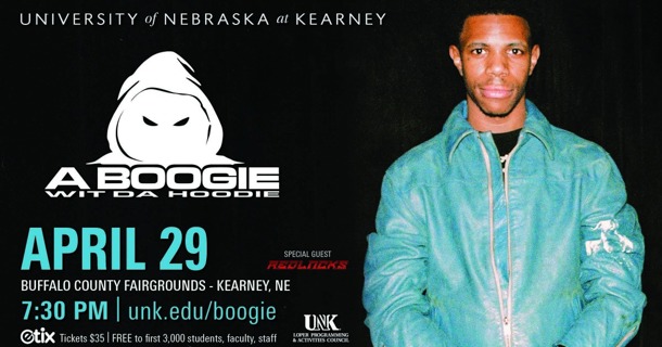 A Boogie Wit da Hoodie will headline UNK’s Spring Concert at 7:30 p.m. Wednesday, April 29, at the Buffalo County Fairgrounds.